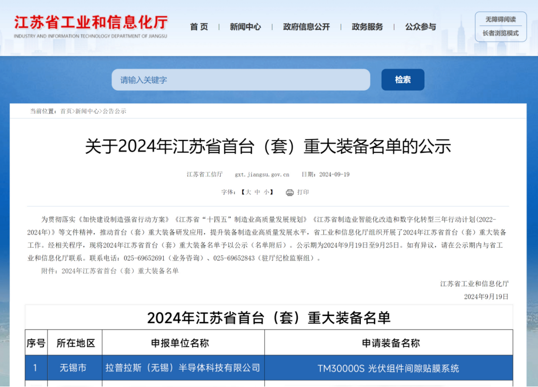 近日,江苏省工业和信息化厅公示了《关于2024年江苏省首台(套)重大装备认定名单》,拉普拉斯(无锡)半导体科技有限公司自主研发的TM30000S 光伏组件间隙贴膜系统装备成功入选。该产品的成功开发和产业化是我国在新能源技术领域取得的又一突破,填补了国内在此环节的空白。该设备进一步提高了光电转换效率与输出功率,降低了光伏组件的制造成本,为实现更加高效、节能的太阳能利用提供了强有力的技术支撑。
