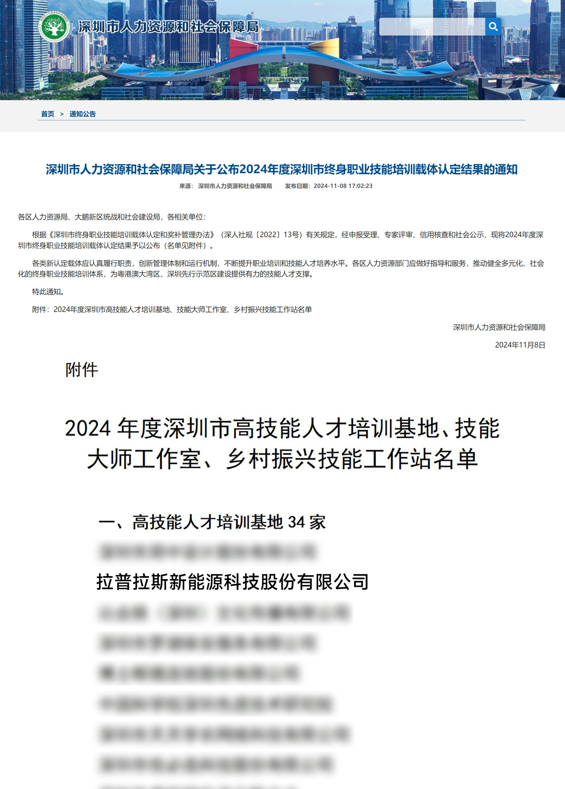 2024年11月8日,深圳市人力资源和社会保障局公布了2024年度深圳市终身职业技能培训载体认定结果。拉普拉斯新能源科技股份有限公司(以下简称”拉普拉斯”)荣获2024年度深圳市高技能人才培训基地称号!